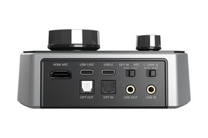 この他にも入力端子として、光デジタル(HDMIとどちらか一方のみ利用可能)、マイク入力、3.5mm 4極プラグ対応のLINE IN、そして2系統のUSB Type-Cを搭載。複数の音声入力をミックスして同時に再生することも可能で、例えばUSB入力1にゲーム機、USB入力2にボイスチャット用スマートフォンをそれぞれ接続し、音声をミックスして再生することができる。出力端子は、3.5mmヘッドホン出力、光デジタル出力、LINE OUTを備える。