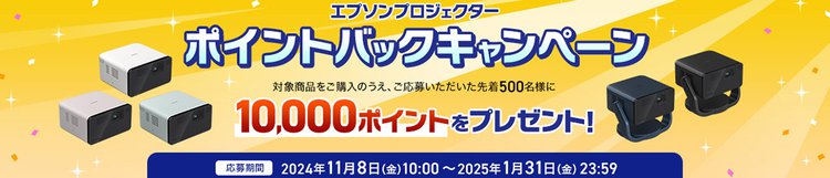 エプソンは、本日10月24日発売のコンパクトプロジェクター「EF-21」「EF-22」の購入者を対象に、先着で500名に10,000円分のデジタルギフトをプレゼントする「ポイントバックキャンペーン」を、11月8日(金)10時からスタートすることを発表した。