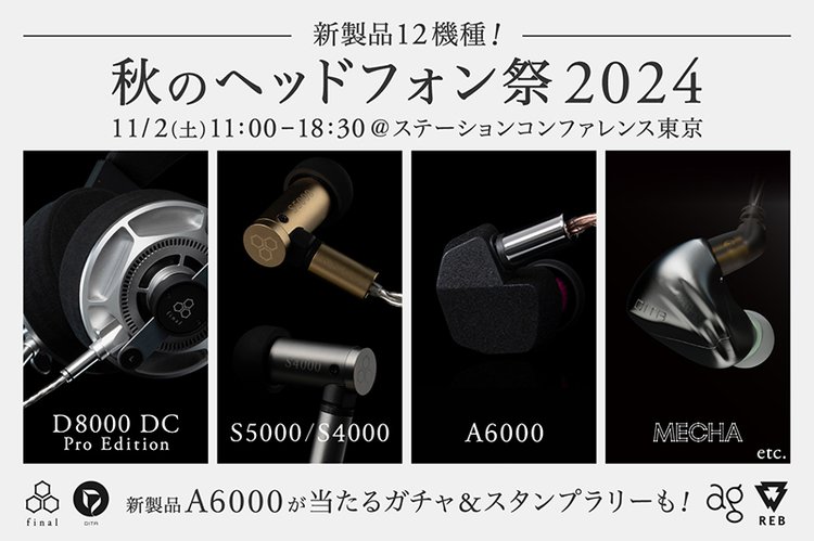 finalは、今週末11月2日(土)に開催される国内外80社のオーディオメーカーなどが一堂に会するフジヤエービック主催の展示会イベント「秋のヘッドフォン祭2024」に出展。新製品や未発表機などの新モデル展示に加え、フラッグシップイヤホンやヘッドホンが当たる「ヘッドフォン祭会場限定finalガチャ」や「新製品が当たるfinalスタンプラリー」などを実施する。