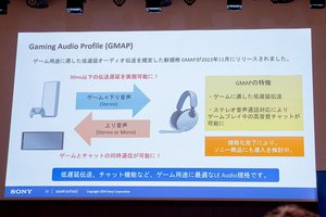 またLE Audioの「低遅延」を強化する技術として、2023年11月に登場したばかりの「Gaming Audio Profile(GMAP)」を紹介。名前の通りゲーム用途に最適な技術で、伝送遅延は30ms以下を実現し、ステレオとモノラルの両方に対応。ゲーム音声とボイスチャットの高音質な伝送をサポートするという。上述の通りまだ策定されたばかりの技術だが、規格化の完了にともない、ソニー製品でも導入に向けた検討が始まっていることが明かされた。