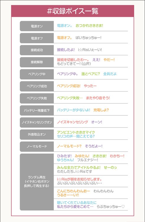 イヤホンの起動/終了や端末との接続状況を知らせる「ボイスガイダンス」と、任意のタイミングで聴ける「ランダムボイス」を完全新録。計450種類以上のボイスを備える。ボイスのモードとして、各メンバーの「ソロモード」を5種、メンバー同士の掛け合いが楽しめる「カップリングモード」を10種、全員で操作をアシストする「i☆Risモード」1種の計16モードを搭載した。