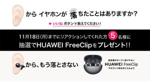 さらに本日11月1日から、新たに「イヤホン落ちたことある?」アンケートキャンペーンを開催する。同社は今回の川柳募集に際して、多くのイヤホンユーザーが「イヤホンが耳から落ちちゃう問題」を抱えていることがわかったと指摘。キャンペーン応募者のなかから抽選で5名に、激しく首を振っても落ちにくい安定感を実現したというイヤーカフ型ワイヤレスイヤホン「HUAWEI FreeClip」をプレゼントする。