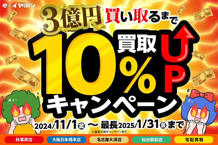 対象期間中に同店の買取サービスを利用すると、もれなく買取金額が10%アップされる。対象店舗はe☆イヤホン秋葉原店/大阪日本橋本店/名古屋大須店/仙台駅前店の4店、および宅配買取。買取総額が3億円に達し次第キャンペーンは終了となる。