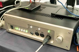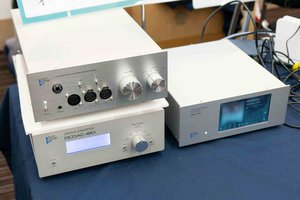 ディスクリート設計のアンプ出力段をはじめ、音質を最優先した信号経路レイアウト、XLR入力/RCA入力のどちらも2系統ずつ搭載するなど、音質と接続性の両面で特徴をもつ。また同ブースには、ESS社製DAC「ES9038Pr」搭載で5種類のデジタルフィルターを内蔵したUSB-DAC「DCDAC-180」、トランスに整流回路と安定化電源を使用したリニア式電源を導入しているミュージックサーバー「MS-100」といった製品も並んでいた。