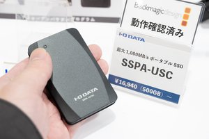 ストレージでは、アイ・オーが手掛けるカメラやスマートフォンに取り付けられるコンパクトタイプのSSDや、SanDisk Professionalブランドの “PRO-BLADEシリーズ” など、カメラからPCへ高速で撮影データを移動できる製品をプッシュ。PRO-BLADEシリーズは、最大4TBのカートリッジ型SSDをケースに差し込んで使用するモジュール式で、デスクトップPC用ケースには最大4本のカートリッジを同時に挿し込み、データ転送をすることができる。