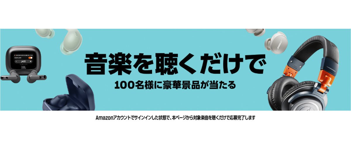 本キャンペーンは、Amazon.co.jpアカウントでサインインした状態で、指定のAmazon Musicプレイリストを再生すると、オーディオテクニカやボーズ、JBL、ゼンハイザー、ソニーのイヤホン・ヘッドホンが抽選で合計100名に当たるというもの。11月15日(金)から開始されており、応募期限は12月31日(火)23:59まで。