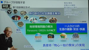 ふたつめの地球環境問題の解決に対する取り組みでは、持続可能な社会の実現を見据えた2050年のグループ長期環境ビジョン「Panasonic GREEN IMPACT」を掲げる。「温暖化の解決に向けては、2030年に自社の生産活動におけるCO2排出を実質ゼロ化して参ります。加えて、幅広い事業領域でお客様や社会が排出しているCO2の削減にも貢献していきます」と力を込めた。