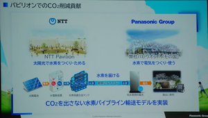 NTTと共同で行う水素活用の実証では、NTTパビリオンで太陽光から水素をつくり、約200メートル離れたパナソニックのパビリオンまで地中パイプラインで水素を届け、純水素燃料電池で発電し、パビリオンのライトアップに使用する。