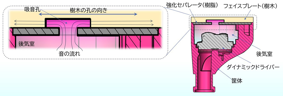 その上で「イヤホンでもっともリアリティのある弦楽器の音の再現」を目指し、従来モデルに搭載していた「HDSS」を廃止。そして樹木の持つハニカム状の孔を吸音材として用いる独自技術「SAHP(Sound Absorbing Honeycomb Pores)」を新たに採用。フェイスプレート素材にサウンドとSAHPの適性がマッチしたという国産の「道南杉」を選択し、広い空間表現はそのまま、弦楽器の音の忠実性をターゲットにチューニングを施したとする。