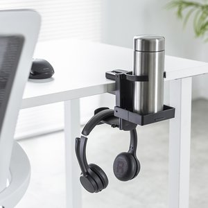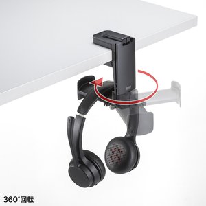 テーブルの天板に挟んで取り付ける仕様で、スライド式のフックを引き出すことで2台のヘッドホンを掛けることができるヘッドホンフック。通常モデルに加え、ドリンクホルダー付きモデルとマグネットホルダー付きモデルを用意する。
