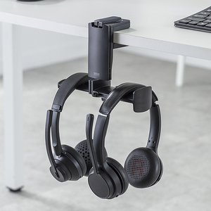 サンワサプライ、2台掛け対応のヘッドホンフック。ドリンクホルダーやスマホスタンド付属モデルも