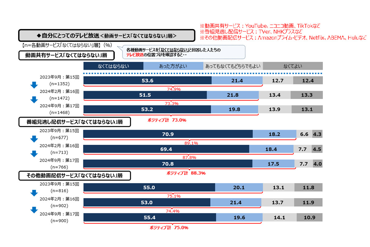 また、「各動画サービスについて『なくてはならない』と回答した層ではテレビ放送の必要度は低いのか」という課題の調査のため、当該層におけるテレビ放送のポジショニングを確認。