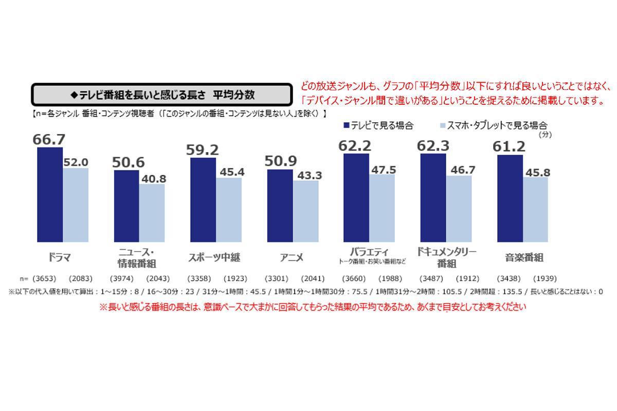 またテレビで視聴する場合において、何分から “長い” と感じるのか割合の分布を調べたところ、ボリュームゾーンは31分から2時間超までと、番組のジャンルごとにバラつきがあった。「2時間超」という回答が多かったジャンルはスポーツ中継で、「長いと感じることはない」という回答も他ジャンルより高く2割強を占めている。これについてA-PABは、スポーツは試合・競技の長さに準ずるため、あるいは試合に集中視聴するため、時間を長いと感じることがない視聴者が一定数存在すると推察している。