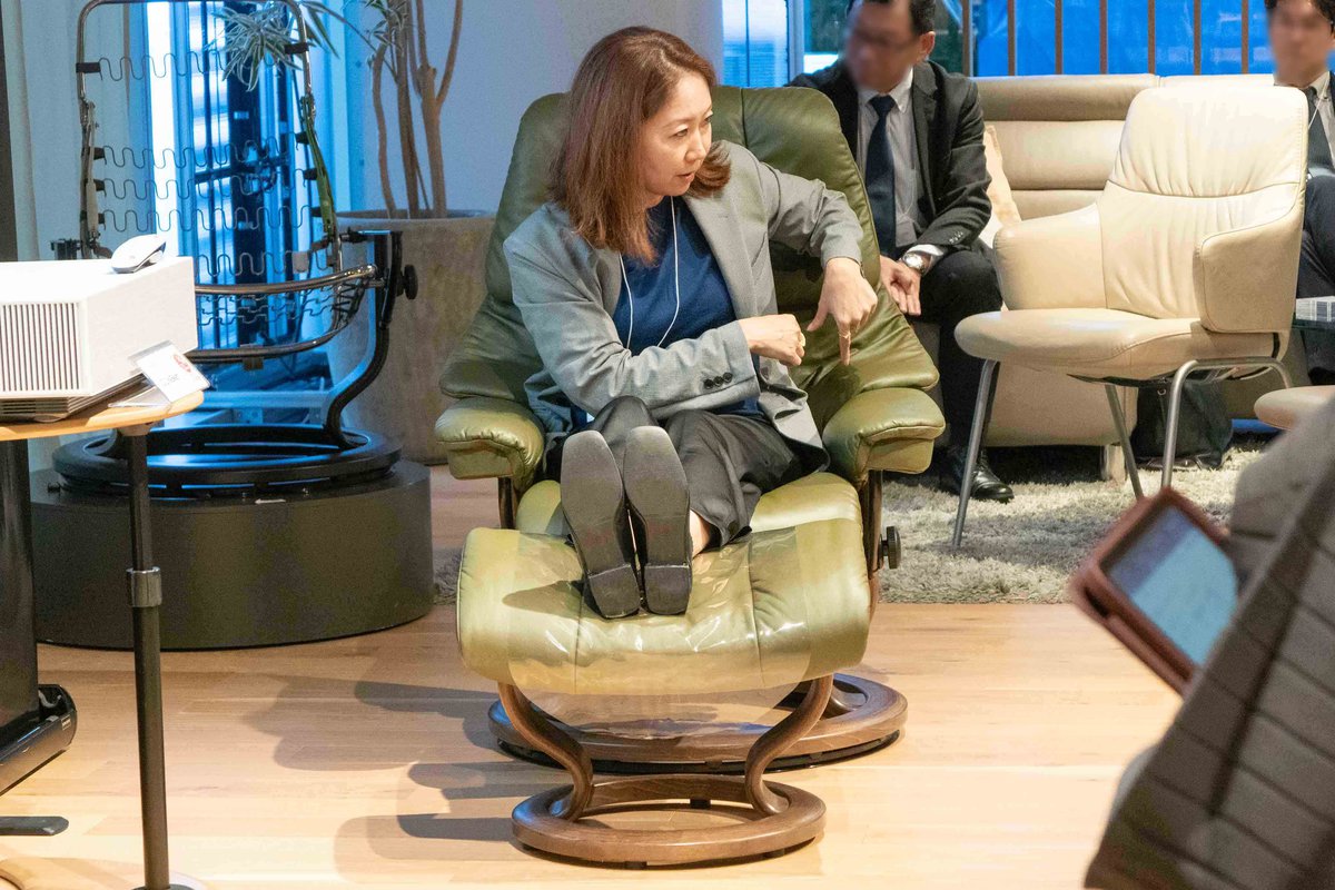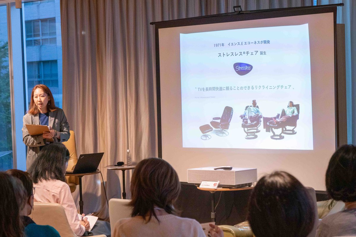 ノルウェー発の企業であるエコーネスはブランド・ヒストリーを紹介するとともに、1971年に誕生した「ストレスレス・リクライニングチェア」が、テレビが家庭に普及し始めた高度経済成長期に、“テレビを長時間快適に観ることができる”リクライニングチェアとして生まれたことを明かし、ストレスレス・リクライニングチェアとオーディオ・ビジュアルに置ける親和性の高さを伝えた。