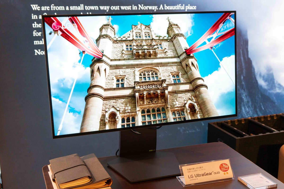 「LG UltraGear Gaming Monitor」からは、31.5インチの4K有機ELゲーミングモニター「32GS95UV-B」と、ダークブランドのデスクにエコーネスのダイニングホームオフィスにラインナップするアーム付ハイバックの「ストレスレス ミント」を合わせることで、コンパクトな空間でも導入しやすいシステムであること提示していた。