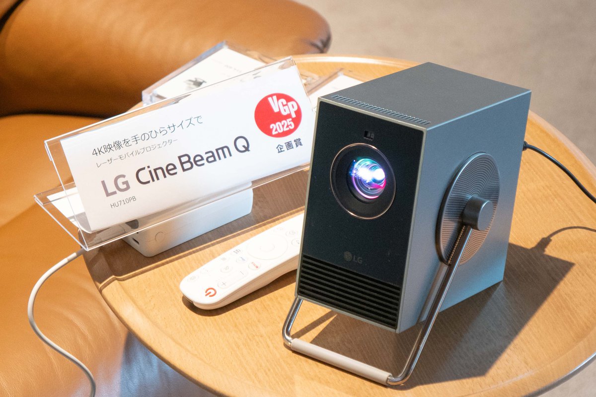 最後は、レーザー光源を搭載したコンパクトな手のひらサイズの4Kプロジェクター「CineBeam Q」を紹介。最大120型の映像投写が可能で高精細な4K映像を表示できるモデルながら、360度回転するハンドルを備えることで手軽に持ち運ぶことができ、加えて角度調整に対応するため壁投写だけでなく天井投写も可能とするモデルを提示した。