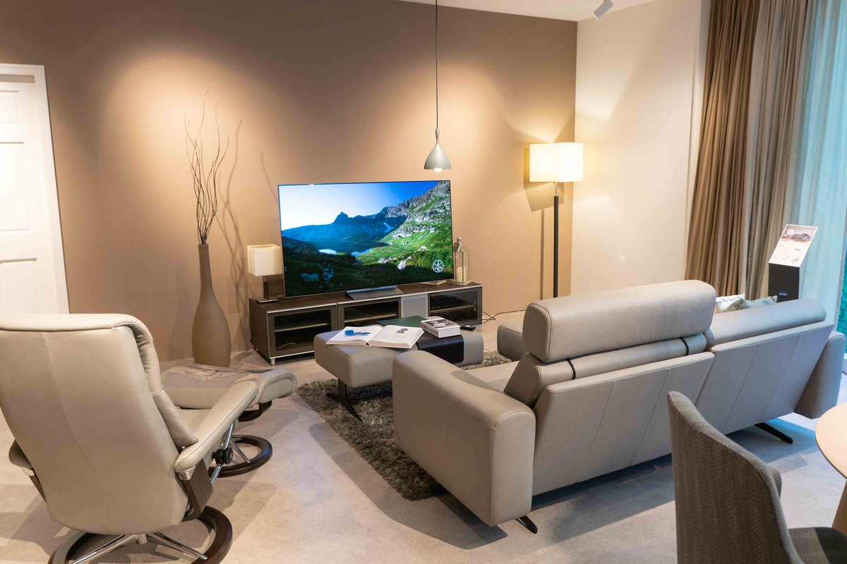 「リビングシアター」では、LGエレクトロニクスの65V型・4K有機ELテレビ「OLED65G3PJA」を設置し、エコーネスの“ホームシアター・一体型ソファ”であり、センターテーブル付きの「ストレスレス アリオン19 ハイバック」(SC 11)とロッキング機能付きのスターベースを採用した「ストレスレス トーキョー」の組み合わせを体感できる場を設けていた。