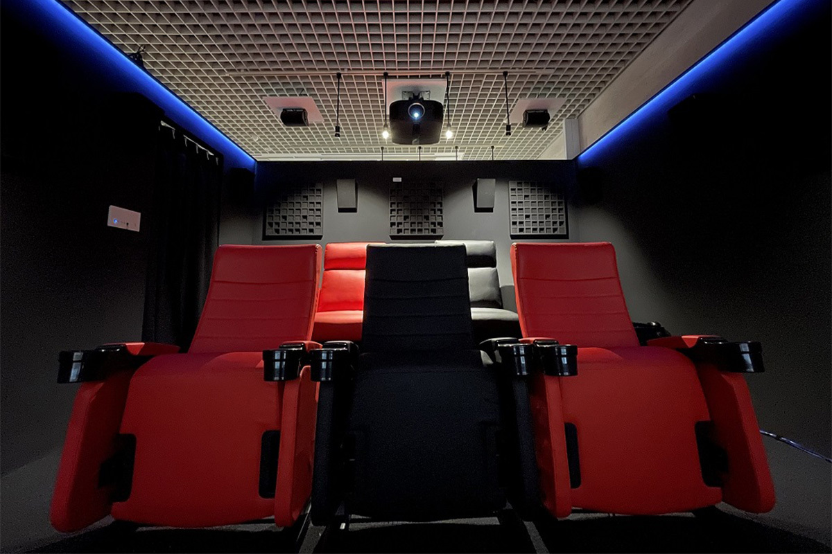 また、部屋の床面にはひな壇を設けて、自社オリジナルのシアターチェアを配置。映画館さながらの雰囲気で映画やコンサート作品、配信映像などのコンテンツを楽しめるシアタールームを提案する。