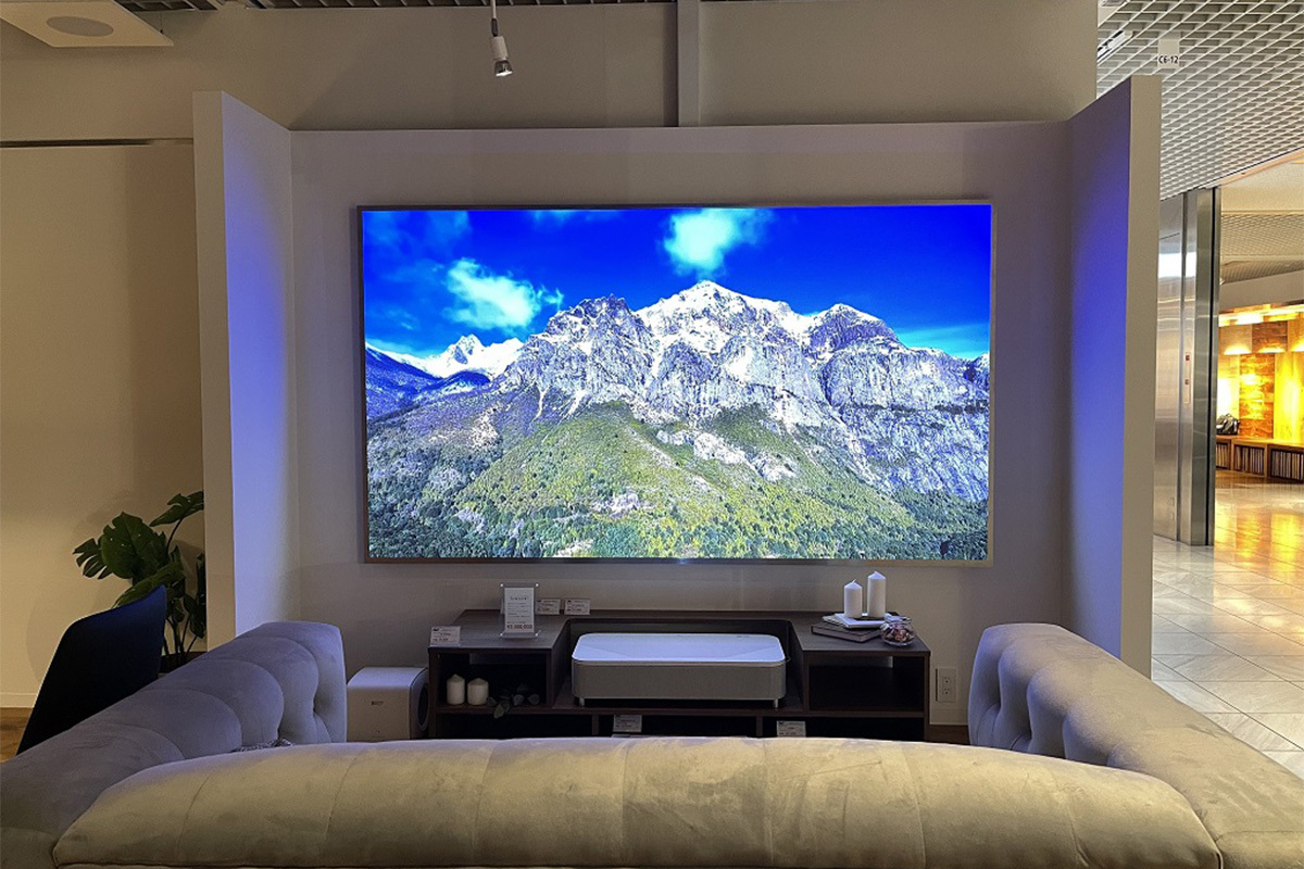 2wayリビングシアターでは、100インチ電動スクリーンと65インチテレビの切り替えが可能な2wayスタイルのホームシアター展示をおこなう。空間はリビングを模して設えており、米Ashley(アシュレイ)ブランドのゆったりとしたソファを配置するなどして、くつろぎ感を演出。