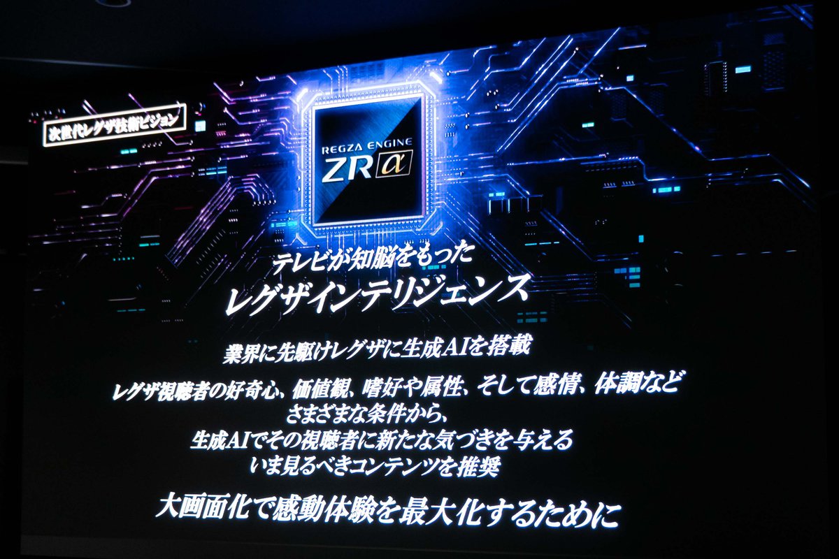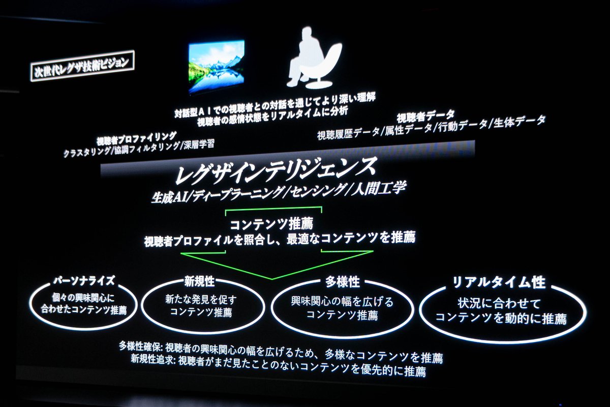 ブースでは、現在開発中の最新技術デモを中心に展示を予定。新たな技術コンセプトとして「レグザインテリジェンス」を掲げた。同社の高画質エンジン「レグザエンジンZRα」などに生成AIを盛り込み、長年培ってきたセンシング技術やユーザーのプリファレンスを組み合わせ、視聴者の嗜好や感心、などさまざまなものを加味して、新しいコンテンツとの出会いを作り出していきたいという。また、新コンセプトの機能によって、大画面の魅力を最大限に感じられる新たなユーザー体験を作り上げていきたいと明言した。