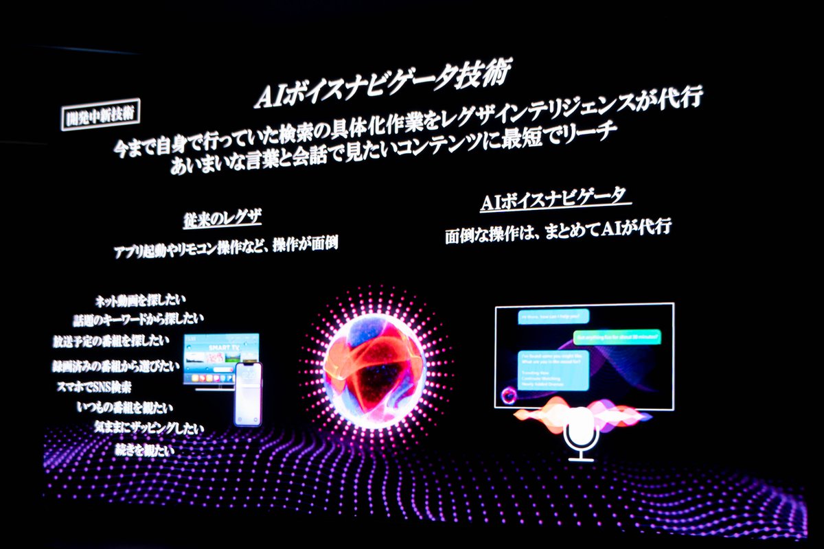 実際のブースでは、「レグザインテリジェンス」に順じた機能のひとつとして「生成AIボイスナビゲーター」のデモを展開。今までの映像コンテンツの出会い方は、作品のタイトル名やアーティスト名など具体的な名称を入力して検索したり、検索ワードを工夫したりすることで、検索ヒット率を上げる方法を用いることが主流だった。この具体化作業を「生成AIボイスナビゲーター」が代行するものだという。