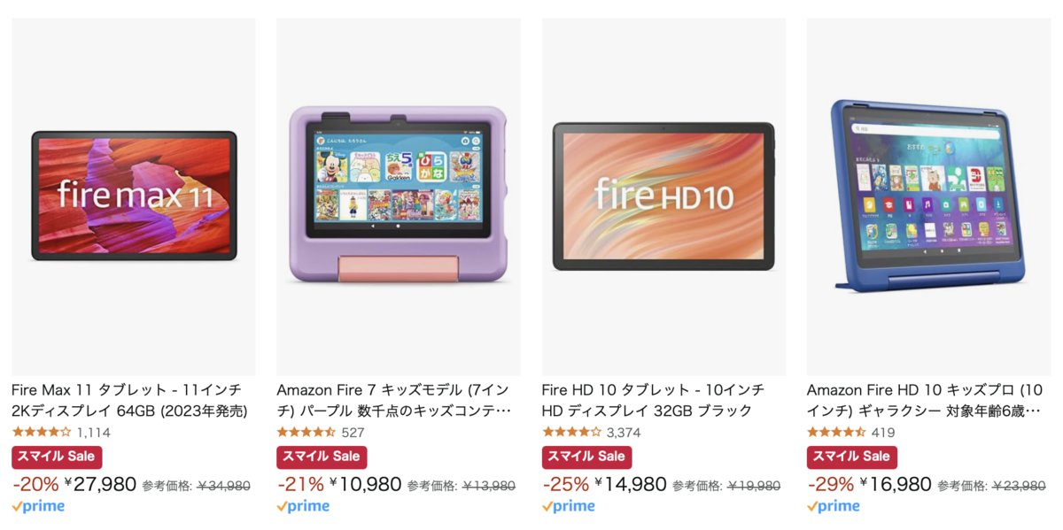 AmazonスマイルSALE、「Fireタブレット」が最大7000円オフ!まとめ買いで1000円オフも