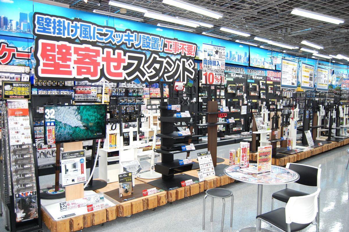 そして、もうひとつの相棒が「壁寄せスタンド」だ。「大きなテレビをできるだけ省スペースに導入したい」「部屋を広く使いたい」といった要望に応えるもので、展示するテレビも多くが壁寄せスタンドと組み合わせられ、「壁寄せスタンドコーナー」にはズラリと商品が並べられている。