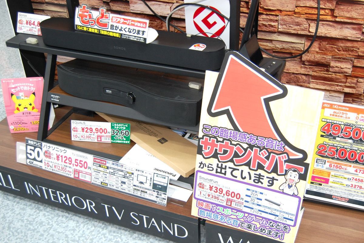 お客様にはテレビにスピーカーを加える意義を説明するだけでなく、出来得る限り実際に試聴していただいており、店内に展示するテレビにも、サウンドバーをはじめとするスピーカーを組み合わせた展示が数多い。