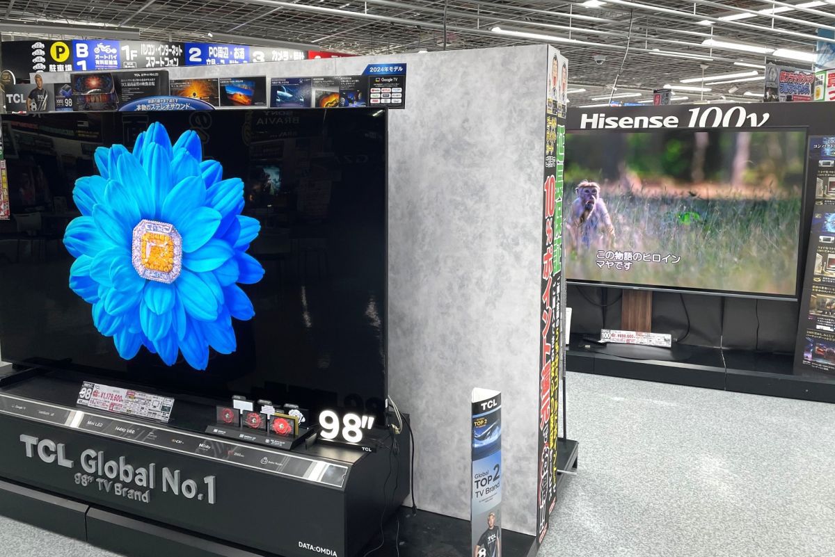 大型家電量販店のテレビコーナーへ足を運ぶと、そこで目を奪われるのが画面サイズのさらなる大型化だ。ヨドバシカメラの旗艦店「ヨドバシカメラ マルチメディアAkiba」(東京都千代田区)では、実に70V型以上のテレビ47台が展示されている。そのうち80V型以上が21台、115V型を筆頭にした100V型クラスも4台あり、まさに目を丸くする光景が広がっている。