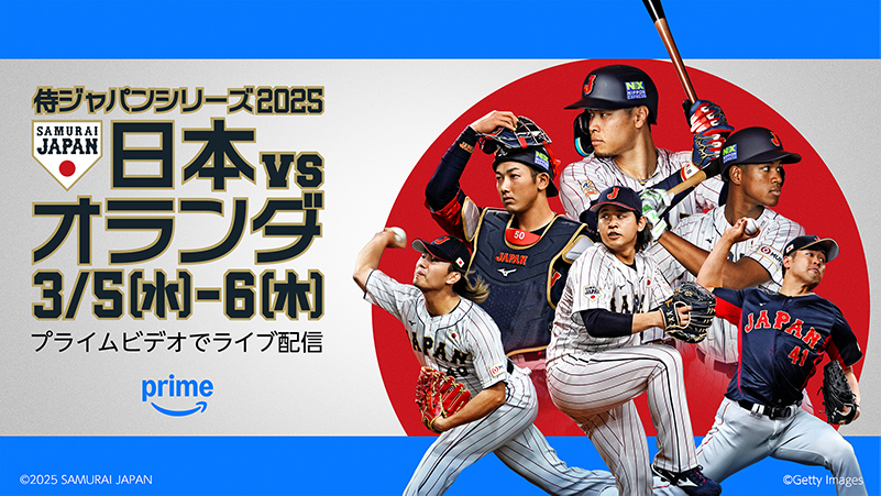 Amazon Prime Videoは、3月5日(水)と6日(木)に京セラドーム大阪で開催される野球日本代表「侍ジャパン」とオランダ代表による強化試合「ラグザス 侍ジャパンシリーズ 2025 日本 vs オランダ」を、地上波を除いて独占ライブ配信する。