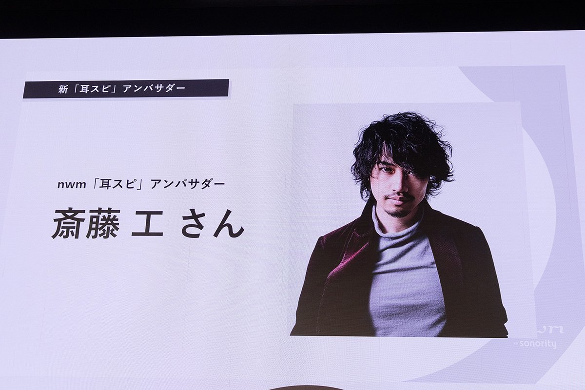 発表会には新アンバサダーの斎藤工氏がゲストとして出演。nwm耳スピの感想を聞かれると「製品が本当に素晴らしい。(斎藤氏が使っている姿を通して)すでに2名が買ってくれている」と、早くもアンバサダーとして活躍していることを語る。