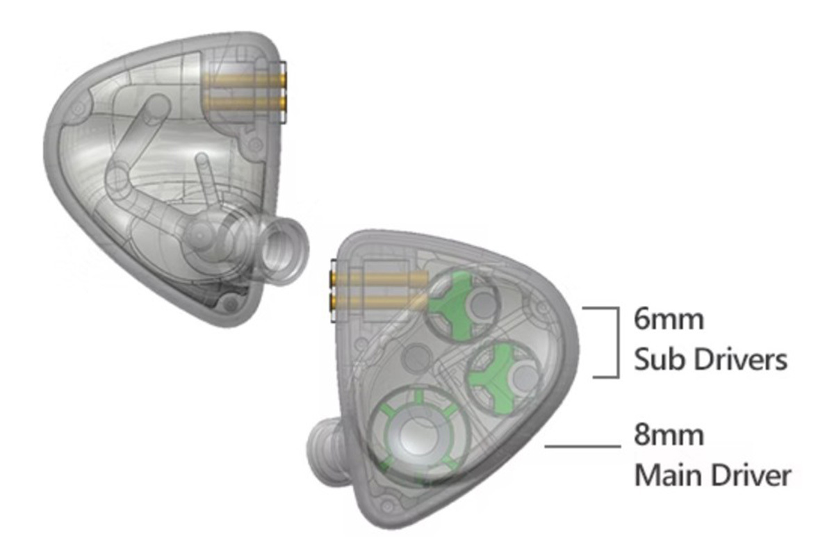 ドライバー構成は8mm径のダイナミックドライバー1基と、6mm径のダイナミックドライバー2基を採用する。8mmドライバーをサウンドの中核に据え、それを6mmドライバー2基が補完することで低音域/中低音域を強化。パワフルで重厚なサウンドを実現するとのこと。また、ドライバー間の位相差を最小限に抑える設計により、広い周波数帯域で自然なサウンドを再生するとした。