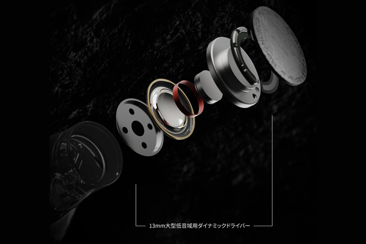 13mm径ダイナミックドライバーはおもに低域の再生を担当する。フェイスプレートをドライバーの背面側に配置する新設計を採用しており、これによって13mm径の大型ダイナミックドライバーの搭載を実現した。小型ダイナミックドライバーや、複数のBAドライバーを搭載するのと比べて、より広いダイナミックレンジと低歪みを確保したとする。