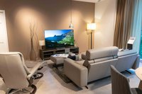 「二人暮らしのシアターシーン」では、「天井モバイルプロジェクター GV50」の壁投写の映像を体験。二人でカジュアルに楽しむホームシアターをイメージしており、モダンでシンプルなデザインにラグジュアリーさも兼ね備えたホームシアターソファの「ストレスレス アリオン SC11」を組み合わせている。