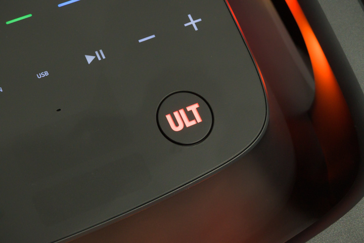 低音強化機能のULT POWER SOUNDモードは2段階で設定でき、天面のULTボタンを押すごとに切り替わる。1段階目の「ULT1」モードは低域の深みを強調し、2段階目の「ULT2」モードでは低域のパワーを増幅するとのこと。
