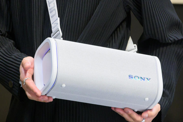内蔵バッテリーにより、電源コードを繋がずとも最長約25時間(ULTモードオン時)の連続再生が可能。おすそわけ充電/急速充電に対応し、急速充電では10分の充電で約180分再生できる。本体は天面のみ防滴に対応。音楽に合わせて周囲を光で彩る360°パーティーライトを内蔵するほか、移動用にハンドル/キャリーホイールを装備する。外形寸法は410W×910H×456Dmm、質量は約29.6kg。