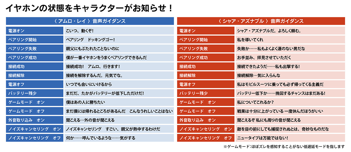 音声ガイダンスは「アムロ・レイ(CV.古谷徹)」「シャア・アズナブル(CV.池田秀一)」の新規録り下ろしボイスを搭載。電源オンで「こいつ、動くぞ!」、ペアリング失敗で「親父にもぶたれたことないのに」(ともにアムロモデル)など、それぞれのキャラクター性を感じさせる計13ワードのボイスを楽しめる。