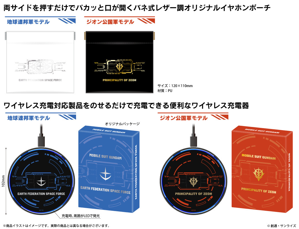 本コラボモデルでは、地球連邦軍「アムロ・レイ」モデル、ジオン公国軍「シャア・アズナブル」モデルの2タイプを用意。充電ケース天面には地球連邦軍、ジオン公国のイメージモチーフ、左右ハウジングには各キャラクターを象徴するアイコンを配置している。