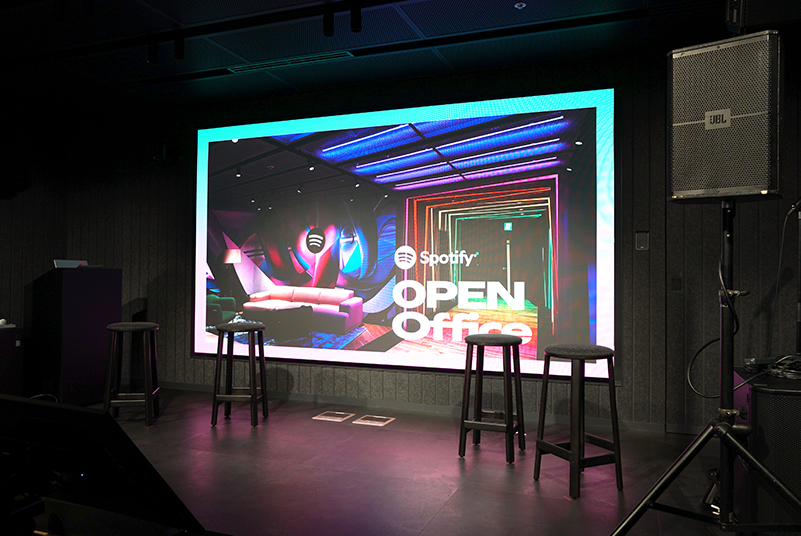 音楽が中心にある企業であることを受け、今回のプレゼンテーションを実施している特別ステージやSpotify独自のリスニングルーム、また音楽配信と共にSpotifyの主要コンテンツの1つであるポッドキャストのスタジオが併設されている点をアピールする。