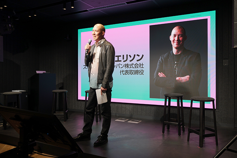 演目は、同オフィスに入ってすぐ左手に位置する豪華なステージ上で行われた。イベント冒頭にSpotify Japan代表取締役を務めるトニー・エリソン氏が登壇し、Spotifyの9年間の歩みを振り返りながら、Spotifyのカルチャーを体現する新オフィスについて紹介した。