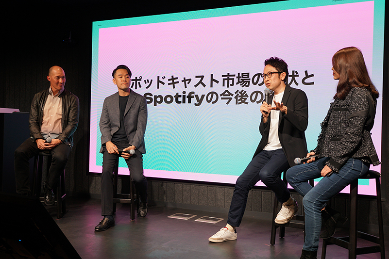 続いて、Spotify Japan各事業部のリーダーを招いてのパネルトークセッションを実施。ここからはトニー氏に加えて、音楽事業部部門統括の大西 響太氏、音声事業部門(ポッドキャスト)統括の渡海 佑介氏、広告事業部門統括の立石ジョー氏の4名が登壇し、各テーマに沿ったトークが繰り広げられた。