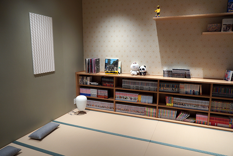 部屋一面が畳の中、横になって休める休憩スペースや、社員同士がカジュアルに意見を出し合ったりリラックスしながら仕事をするスペースが設けられている。また、部屋内にはレコードや漫画なども多数常設されていた。