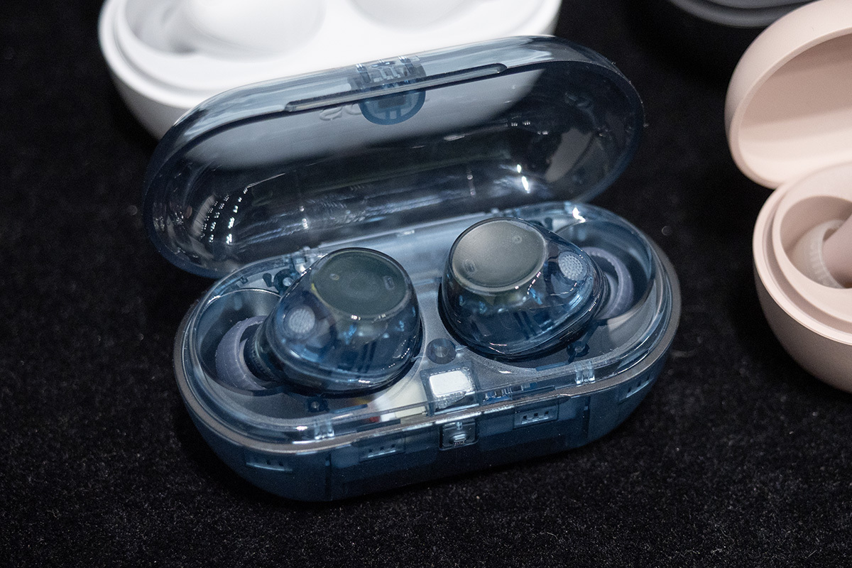先述の通り、カラーバリエーションはホワイト/ブラック/グラスブルー/ピンクの4色を用意。とくにグラスブルーカラーは、同社の完全ワイヤレスイヤホンとしては初めての半透明デザインとなっており、深いブルーとガラスのような透明感が印象的なカラーとアピールしている。