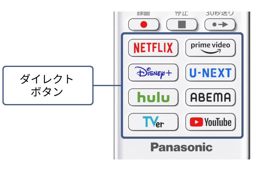 YouTube/Prime Video/Netflix/Apple TV/Disney+/U-NEXT/ABEMA/TVer/NHK+/WOWOW/DAZNなど、多数のVODサービスに対応。付属リモコンには、VODサービスへのダイレクトボタンも備えている。また「接続機器ホーム」ボタンを押せば、HDMI接続されている機器のホーム画面を手軽に出力することができる。