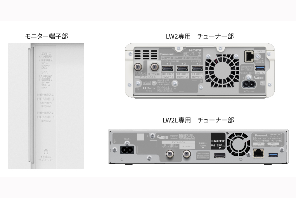 LW2/LW2Lシリーズの主な仕様について、TH-65LW2/TH-55LW2には、デジタルチューナーが地上×3基/BS・110度CS×3基/4K BS・110度CS×2基、主な入力端子がHDMI×5基(モニター部→入力2基/eARC対応、チューナー部→入力×3基)、ステレオミニ×1基、USB Type-A×4基(モニター→入力×2基、チューナー部→入力2基)、LAN×1基搭載されている。