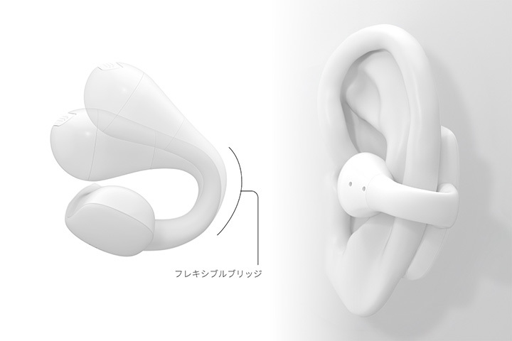2つに別れた筐体を、適度な柔軟性を持つシリコン製の「フレキシブルブリッジ」でつなぐ構造により、耳を優しく挟み込むようにフィット。さらに耳の裏側に沿って広がる形状が圧力を分散し、長時間でも快適なリスニングが楽しめるとする。