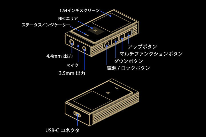 連続再生時間は、LDAC接続時で約4.5時間(バランス)/約6.5時間(シングルエンド)。再生周波数帯域は20Hz - 40kHz(-0.5dB)。THD+Nは0.0008%(@32Ω)。S/Nは128dB(バランス)/123dB(シングルエンド)。出力インピーダンスは<1.2Ω(バランス)/<1Ω(シングルエンド)。外形寸法は39W×70H×14Dmm、質量は51.2g。付属品として、無酸素銅導体18芯のUSB Type-C to C OTGケーブルなどが同梱する。