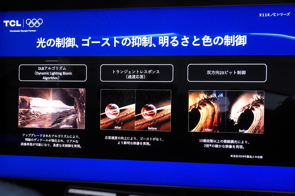 特に量子ドットMini LED搭載の大型テレビにおいては、市場への参入が早かったこともあり、同社がパネルおよび制御技術において高い開発力を持っていることを強調。「2025年はオリンピックのトップパートナーシップの契約を通して、もっとハイエンドかつ国際的なプランドになれるよう努めていくと同時に、従来どおり日本の消費者にとって使いやすい製品を提供していけるよう尽力する」と締めくくった。