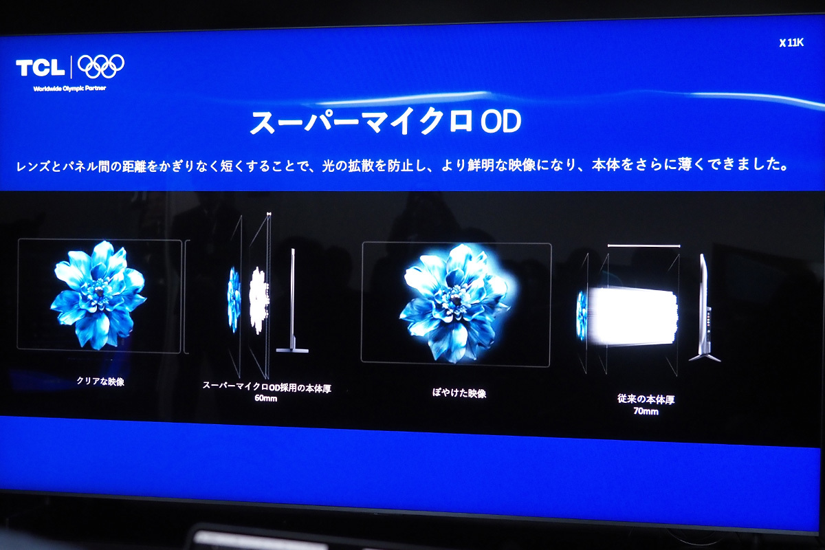 フラグシップモデルである98X11Kはさらにその効果を高める「スーパーマイクロOD」技術も投入する。レンズとパネル間の距離を短くすることで、光の拡散を防止してより鮮明な映像を実現するほか、本体の奥行きを29.9oまで薄型化することを実現した。