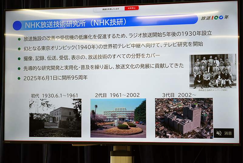 1940年開催予定のなか未開催に終わった幻の東京オリンピックの世界初テレビ中継へ向けてテレビ研究を開始し、今年2025年の6月1日に開所95周年を迎える。